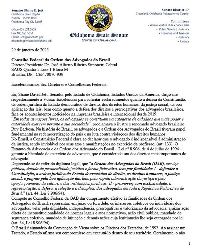 Senator Shane David Jett, from the State of Oklahoma, sent a letter to the Federal Council of the Brazilian Bar Association (OAB) questioning the entity’s performance in the face of allegations of violations of fundamental rights in the country. The information was released by the American parliamentarian on Thursday (30).