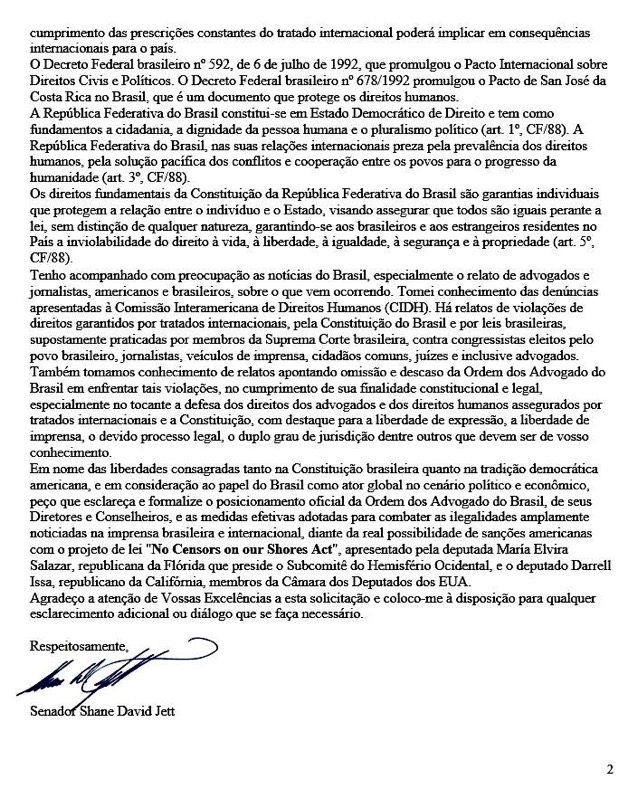 Jett expresses concern about frequent complaints in the Brazilian and international press about violations of fundamental rights, such as restrictions on freedom of expression, censorship and persecution of parliamentarians, journalists and lawyers. The senator also mentions reports sent to the Inter-American Commission on Human Rights (IACHR) and questions a possible omission of the OAB in the face of these accusations.