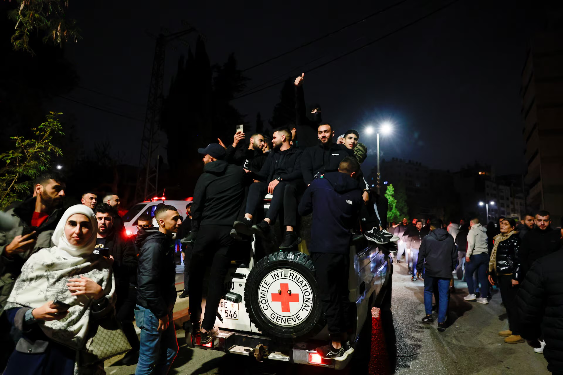 Fireworks were launched in celebration as buses carrying the Palestinian prisoners arrived in Ramallah on the West Bank, where thousands of people waited to welcome them. Those freed from Israeli prisons included 69 women and 21 teenage boys from the West Bank and Jerusalem, according to Hamas.