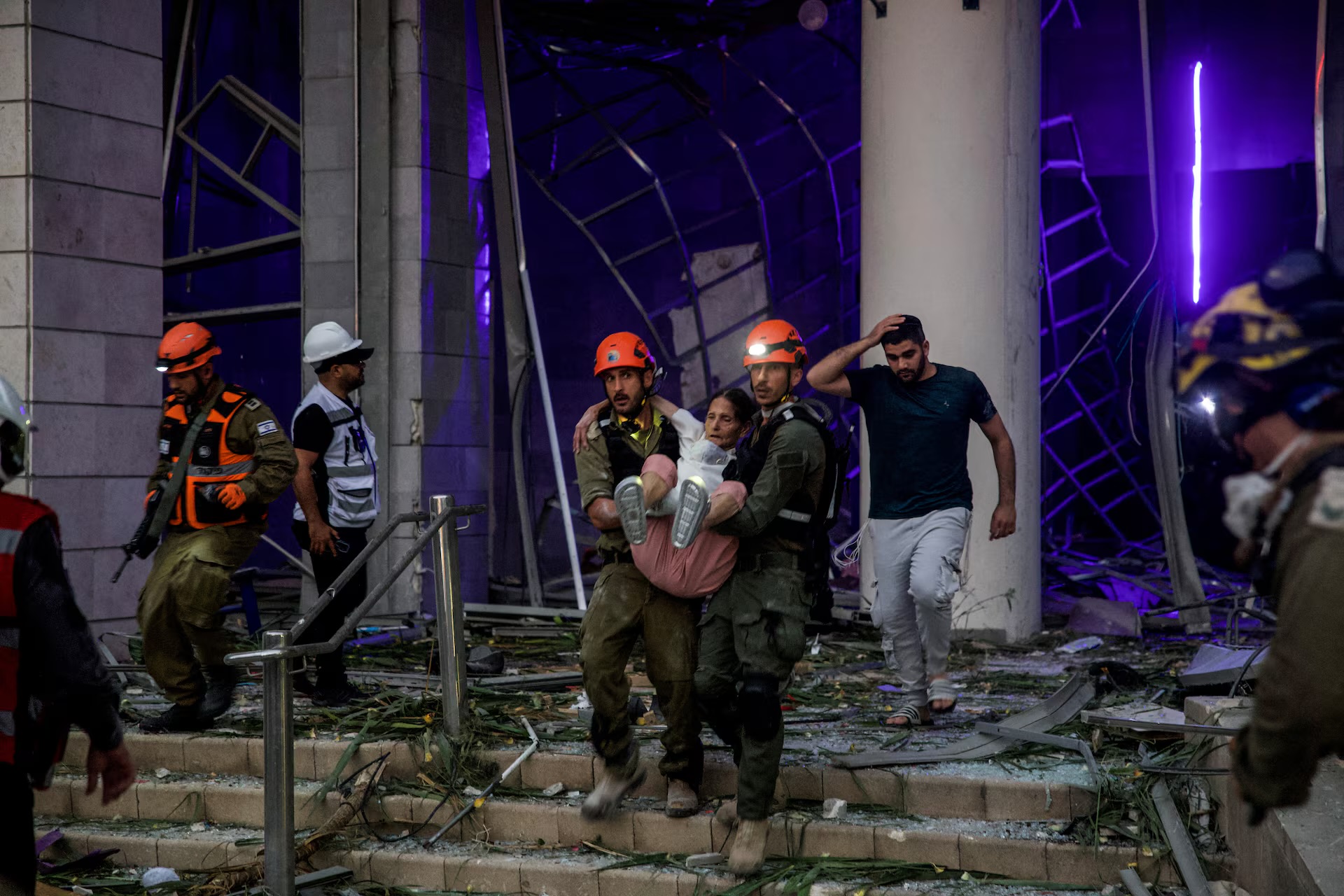 Rescuers evacuate an injured woman from an impacted residential building following a missile attack from Iran on Israel, central Israel, June 16, 2025. REUTERS/Itay Cohen