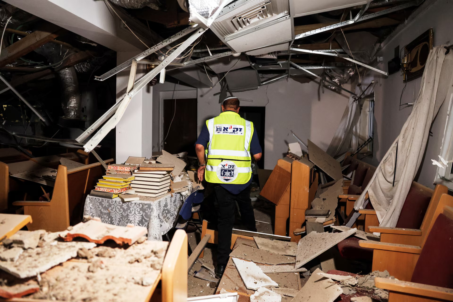 A rescue personal walks inside a damaged synagogue at an impact site following missile attack from Iran on Israel, at Zavdiel, Israel, June 15, 2025. REUTERS/Itay Cohen
