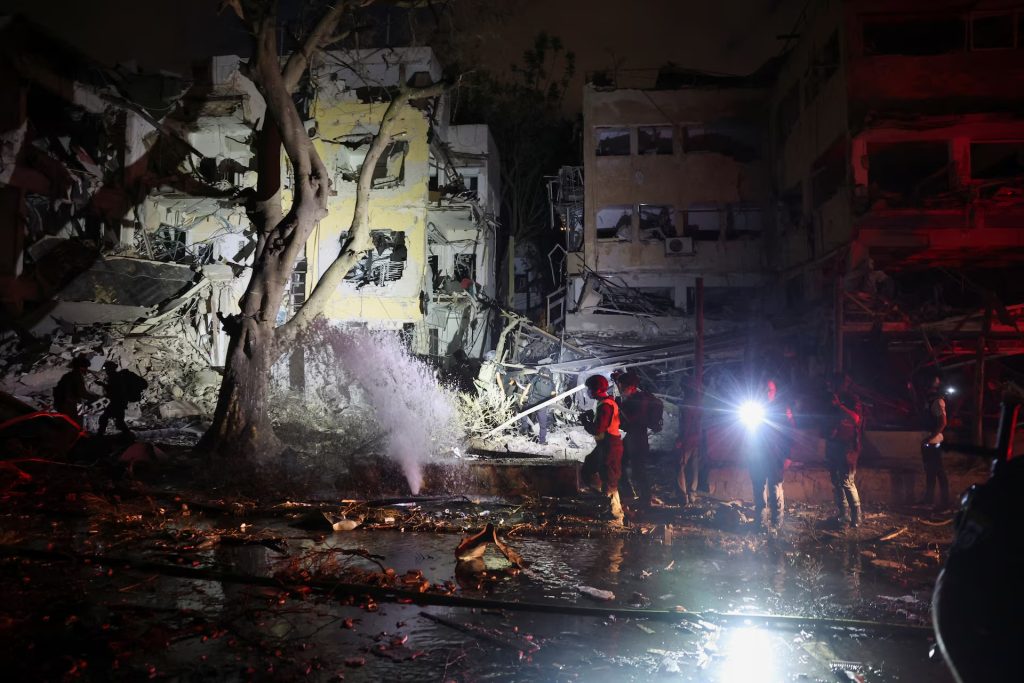]Emergency personnel operate after missiles were launched from Iran to Israel, in Tel Aviv, Israel, June 16, 2025. REUTERS/Ronen Zvulun