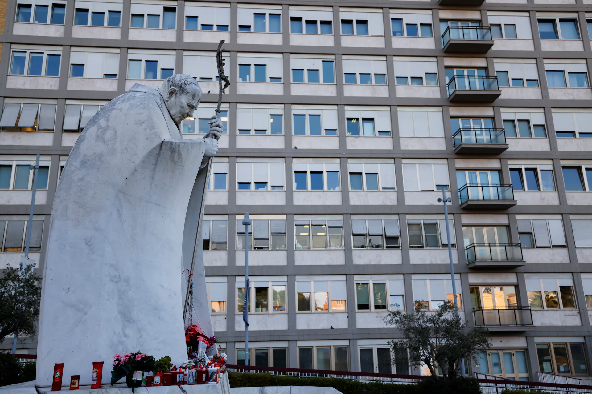 Outside Gemelli hospital, people gathered to pray near a statue of the late Pope John Paul II, who was treated at the facility many times during his long papacy.